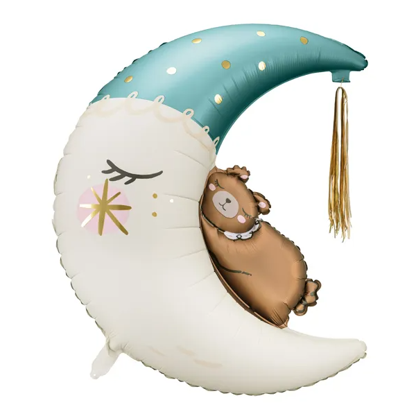 Balon folijski Medvjedić Teddy na mjesecu 80 x 98 cm (FB196-001J) prekrasna je dekoracija koja stvara toplu i bajkovitu atmosferu. Dizajn prikazuje uspavanog medvjedića koji nježno leži na mjesecu, uz elegantan plavi detalj i dekorativnu zlatnu resu.