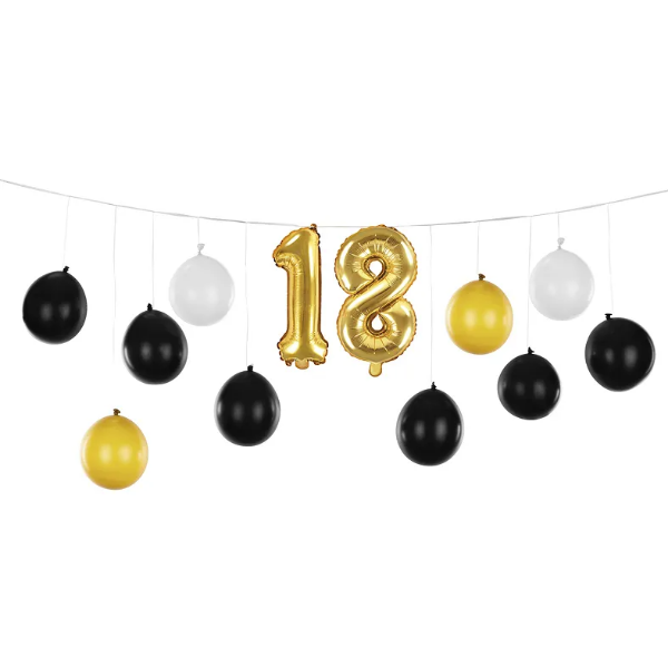 U pakiranju se nalazi sve potrebno za izradu girlande: 10 latex balona, 2 folijska balona s brojem 18, traka dužine 25 m i papirnata slamka za napuhavanje. Girlanda nudi 3 različite opcije sastavljanja, što omogućuje prilagodbu prostoru i željenom stilu dekoracije.