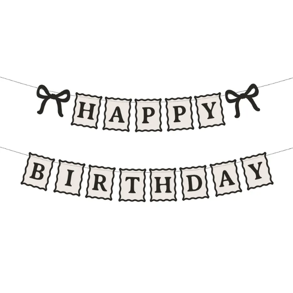 Banner “Happy Birthday” u kombinaciji krem i crne boje savršen je izbor za elegantne i moderne rođendanske dekoracije. Minimalistički dizajn s ukrasnim mašnama daje sofisticiran izgled koji se lako uklapa u različite stilove proslave.