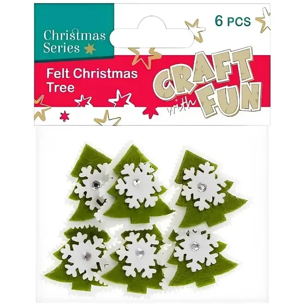Unesite dozu zimskog šarma u svoje kreativne projekte uz set filcanih božićnih borova. Svaki ukras je izrađen od čvrstog, zelenog filca, a u sredini se nalazi bijela pahuljica s dekorativnim kamenčićem koji dodaje diskretan, ali efektan sjaj.