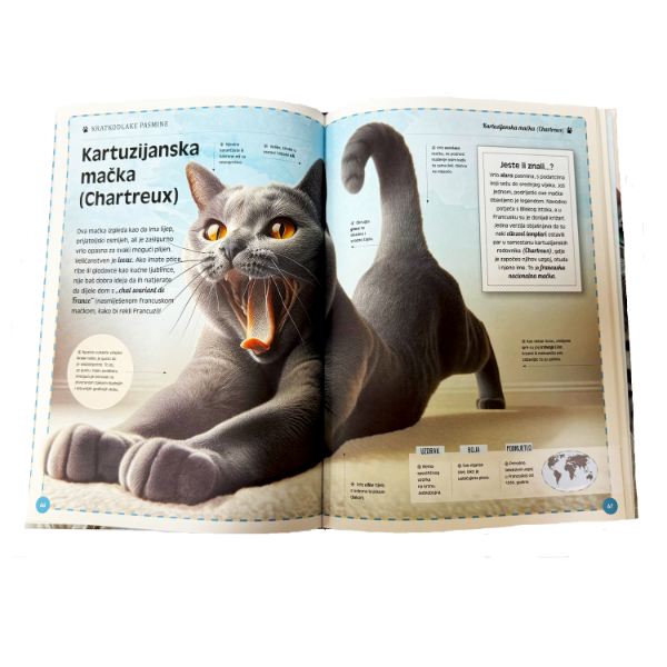 Zahvaljujući velikom formatu i tvrdom uvezu, knjiga je idealna kao edukativno štivo, ali i kao vrijedan poklon za sve ljubitelje mačaka.
