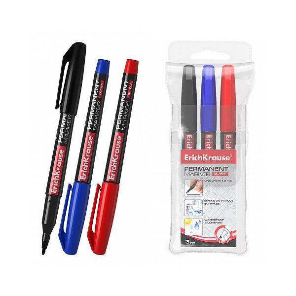 ErichKrause P-70 set permanentnih markera (3 komada) idealan je za svakodnevno pisanje i označavanje na različitim površinama, uključujući papir, karton, plastiku, staklo, metal, CD/DVD diskove i OHP folije.