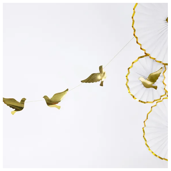 Girlanda zlatne golubice 112 cm (GL13-019M) nježna je i simbolična dekoracija koja prostoru daje svečan i profinjen izgled. Motiv golubica, izrađen od mirror gold papira, reflektira svjetlost i stvara elegantan, blistav efekt.