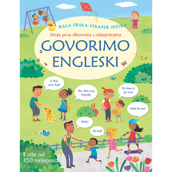 Govorimo engleski – Moja prva slikovnica s naljepnicama dio je Male škole stranih jezika i osmišljena je kako bi djeci na jednostavan i zabavan način približila osnove engleskog jezika. Kroz raznolike ilustrirane prizore iz svakodnevnog života djeca upoznaju prve riječi, izraze i kratke rečenice na engleskom.