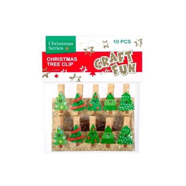 Ovaj set dekorativnih drvenih kvačica s božićnim borovima iz Craft With Fun kolekcije savršena je sitnica koja unosi dodatnu toplinu i čar u blagdanske dekoracije. Svaka kvačica izrađena je od prirodnog drveta i ukrašena simpatičnim borom u različitim nijansama zelene, s detaljima poput glittera i božićnih uzoraka.