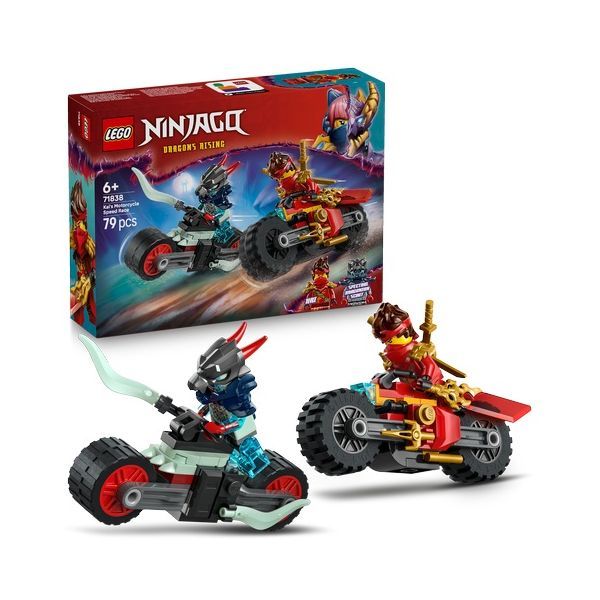 LEGO® NINJAGO 71838 – Kai u brzoj potjeri na motociklu prenosi uzbuđenje iz svijeta LEGO Ninjago u dinamičnu igru punu akcije. Set uključuje dva motocikla i ninja likove, omogućujući djeci da odmah započnu brzu potjeru i osmisle vlastite borbene scenarije.