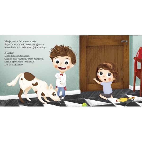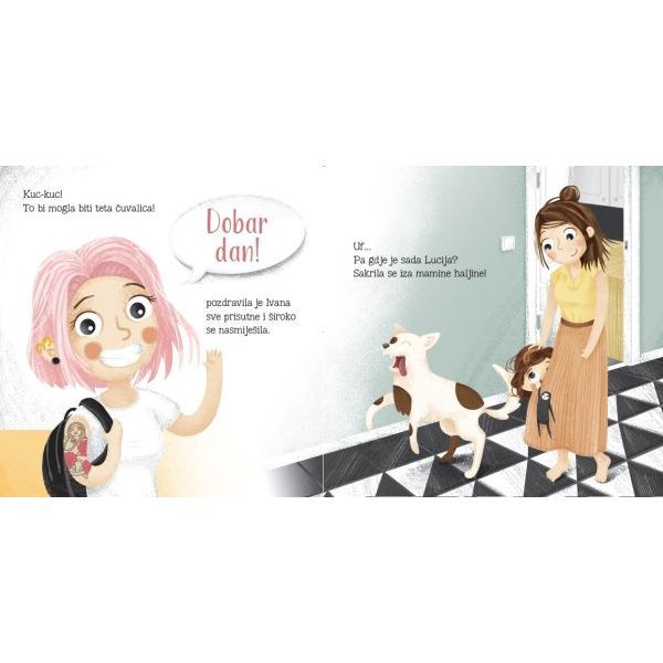 Mama, tata i stariji brat Luka idu na školsku priredbu, a malena Lucija prvi put ostaje s tetom čuvalicom. Odlično se zabavljaju, ali one najtoplije zagrljaje ipak daju mama i tata pa Lucija čeka njihov povratak.