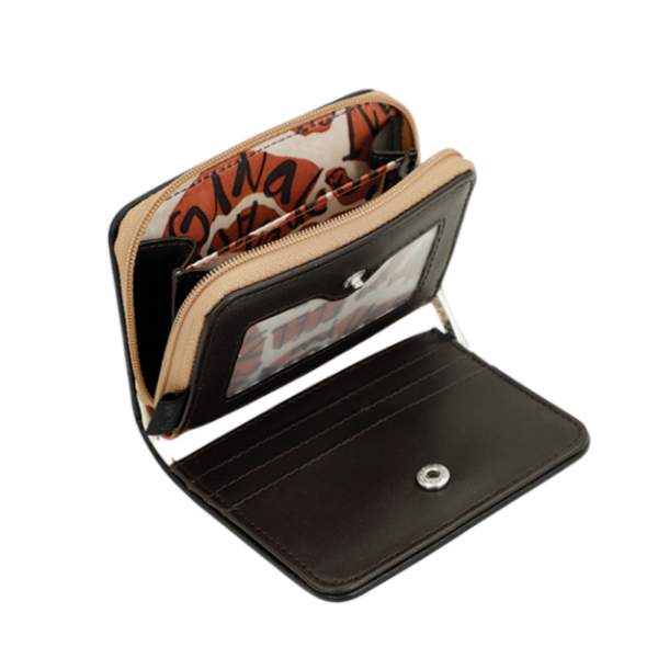 Zatvara se sigurnim patentnim zatvaračem koji štiti sadržaj, dok unutrašnjost nudi više praktičnih pretinaca za organizaciju kartica, kovanica i sitnih osobnih stvari. Unutarnji dio izrađen je od kombinacije 70 % PU i 30 % poliestera, što osigurava izdržljivost i dugotrajnu uporabu, dok je vanjski materijal 100 % PU.