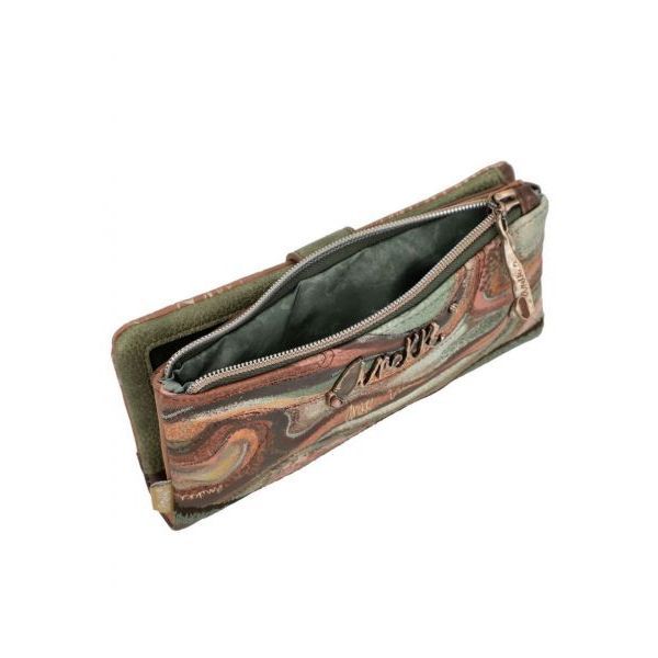 Anekke Outer novčanik ističe se prepoznatljivim dizajnom nadahnutim prirodom, geologijom i slojevima Zemlje, što je motiv cijele Outer kolekcije. Valoviti uzorci u toplim zemljanim tonovima stvaraju dojam umjetničkog pejzaža, dok metalni logo i sitni dekorativni detalji daju dozu elegancije.