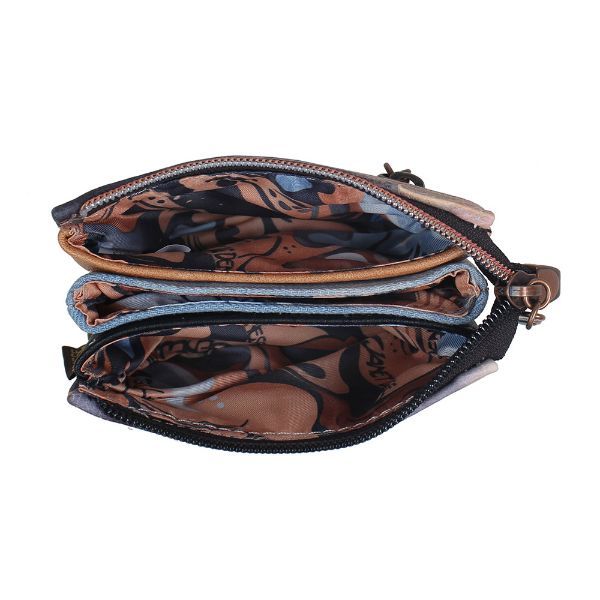Novčanik se zatvara kvalitetnim patentnim zatvaračem, na kojem se nalazi dekorativni privjesak sa zanimljivim antik brončanim finišem i tirkiznim detaljem. Unutrašnjost nudi dovoljno prostora za kovanice, kartice ili druge sitnice — idealno za organizaciju u većoj torbi ili za samostalno korištenje kad želiš ponijeti samo najosnovnije.