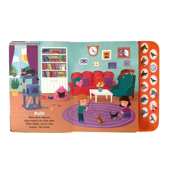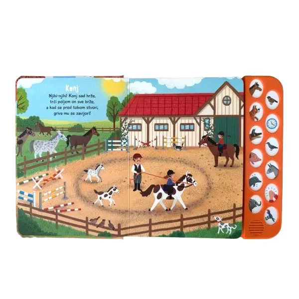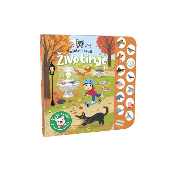 Poslušaj i nauči kako nešto ovdje zvuči! Veseli stihovi i lijepe ilustracije u ovoj slikovnici sa zvukovima raznih životinja oduševit će najmlađe.