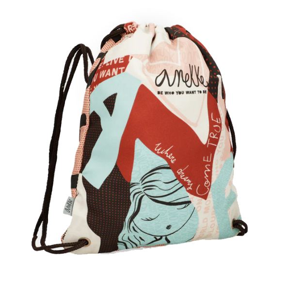 Dizajn donosi prepoznatljive Anekke ilustracije u kombinaciji toplih i pastelnih tonova, uz motivacijske poruke koje inspiriraju svaki dan. Vrećica se zatvara povlačenjem čvrstih špaga, koje ujedno služe kao naramenice pa je možete nositi kao mali ruksak.