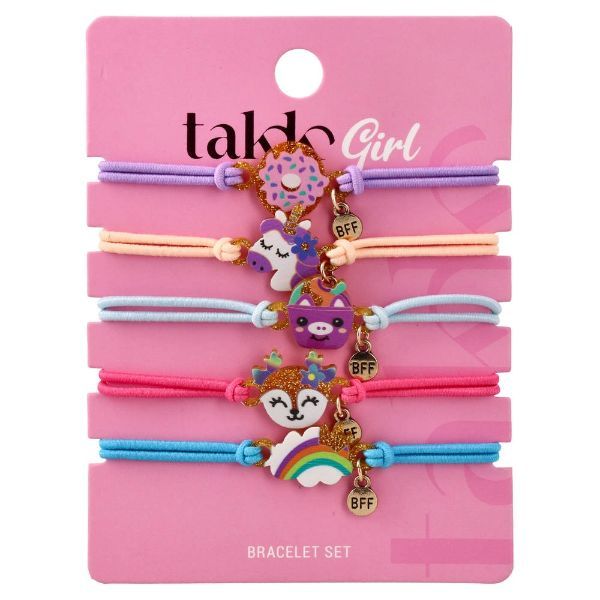 Ovaj veseli TAKK GIRL BFF set narukvica savršen je poklon za male modne zaljubljenice i najbolje prijateljice koje žele nositi iste narukvice. U setu dolazi 5 raznobojnih elastičnih narukvica, svaka ukrašena simpatičnim motivom i metalnim privjeskom BFF: