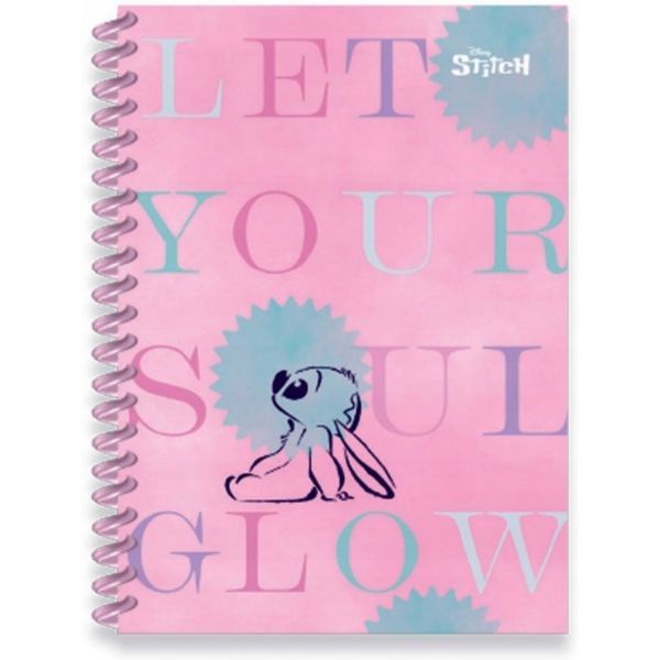 Ova prekrasna Disney Stitch spiralna bilježnica savršena je za svakodnevno zapisivanje ideja, školskih zadataka, planova ili kreativnih misli. Prednja korica dolazi u nježnoj pastelno–ružičastoj paleti, ukrašena velikim tipografskim natpisom “Let Your Soul Glow” i simpatičnom ilustracijom Stitcha u minimalističkom stilu.