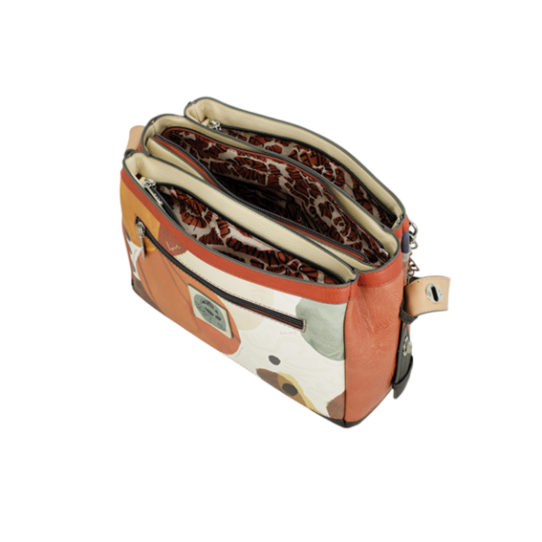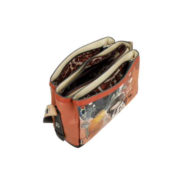 Ovaj model ističe se toplim tonovima, umjetničkom Anekke ilustracijom, dekorativnim detaljima i porukom „Dance with your Alma“, koja torbi daje poseban karakter. Kombinacija uzoraka, kontrastnih boja i pažljivo izrađenih dodataka čini je modnim komadom koji lako privlači pažnju, ali ostaje praktičan za svakodnevno nošenje.