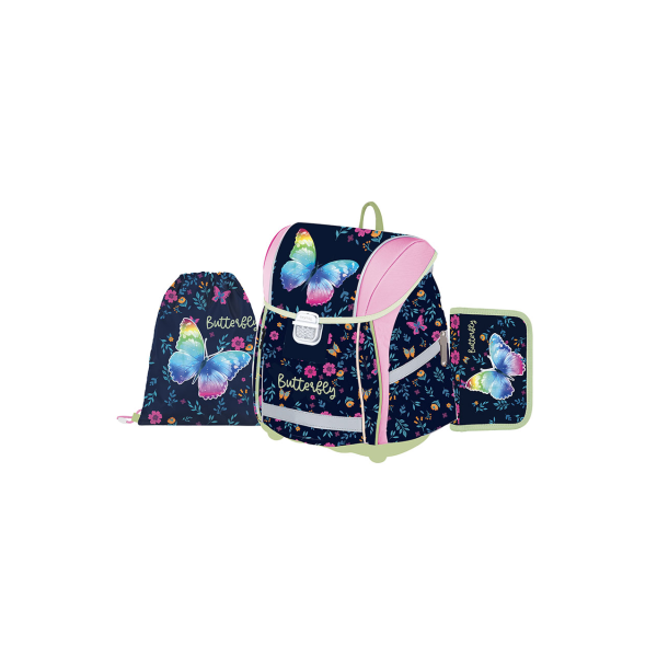 Školski set Butterfly savršena je kombinacija funkcionalnosti, udobnosti i očaravajućeg dizajna. Set uključuje lagani anatomski ruksak, praktiknu pernicu i vrećicu za papuče, sve u istom čarobnom motivu leptira i cvjetova na tamnoplavoj podlozi.