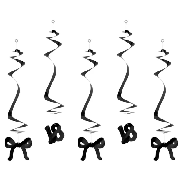 Viseći ukrasi za 18. rođendan u elegantnoj crnoj boji idealan su dodatak za proslavu punoljetnosti. Set sadrži 5 dekorativnih spirala – 2 s brojem “18” i 3 s motivom mašne, što ih čini savršenim za isticanje ove posebne prigode.